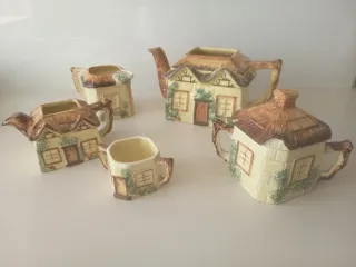 Conjunto que se ve en las fotos de piezas cerámica inglesa con un encantador diseño de casitas tal y como se muestra en las fotos. La tetera grande TIENE UNA PEQUEÑA FALTA en el chorro como se muestra en la foto, que no impide para ser utilizada. - Piezas con detalles de tejado y ventanas. - Acabado en tonos beige y marrón. Tenemos más artículos interesantes. Porcelana Limoges, Capeans, Villeroy Boch, Rosenthal, La Cartuja de Sevilla, Vargas Segovia, figuras Lladró, Nao, Algora, Murano, Nadal, espejos, maletas cuero antiguas grandes.
