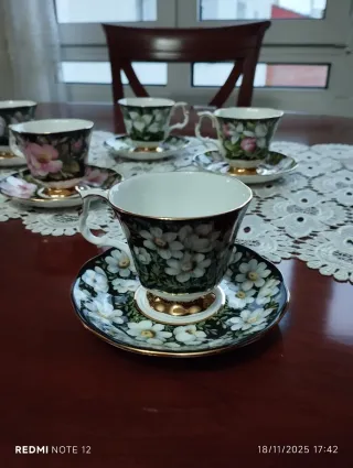 Elegante juego de café de la marca Royal Albert. 6 tazas - Diseño floral sobre fondo oscuro. - Incluye tazas y platillos a juego.