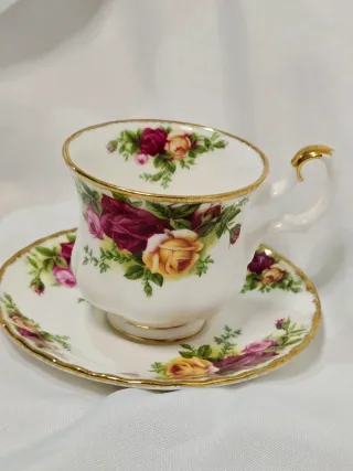 Taza y plato Royal Albert con patrón "Moss Rose". Este diseño clásico se caracteriza por sus delicadas rosas rosadas y toques de flores azules y verdes, con un elegante borde dorado. - El patrón "Moss Rose" fue introducido en 1947 y estuvo en producción hasta aproximadamente 2001. - Forma: Las piezas suelen presentar la forma clásica "Montrose" que se distingue por sus bordes festoneados (ondulados) y asas detalladas. - Medidas: diámetro plato 12,5 cm, altura taza 7 cm.