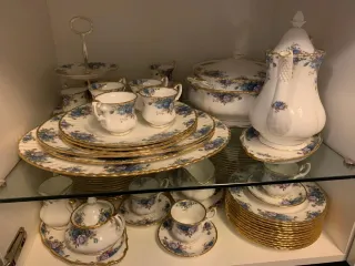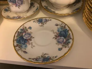 Elegante vajilla vintage del modelo Moss Rose de Royal Albert. Un conjunto clásico con un delicado diseño floral. - Incluye tetera, tazas, platos y más. - Decoración de rosas y flores azules. - Bordes dorados.