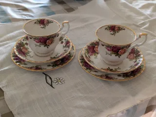 Conjunto de dos tríos de té de la colección Old Country Roses de Royal Albert. Cada trio incluye taza, plato de taza y plato de postre. - Diseño floral clásico con detalles dorados. - Porcelana de alta calidad.