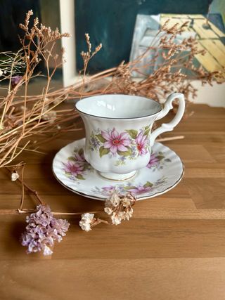 Precioso juego de taza y plato bone china de la casa Royal Albert con un delicado diseño floral. - Taza con asa. - Borde dorado. - Motivos florales en tonos lilas y rosas. Las medidas son 9cm de diámetro y 7 cm de alto. Borde de la taza un poco desgastado