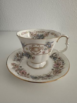 Taza Royal Albert, "Signos del Zodiaco, Cáncer". Taza de esta marca, pero el platillo (perfectamente combinado) es Paragon.