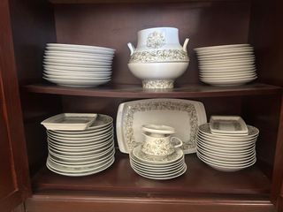 Elegante vajilla de porcelana con un delicado diseño floral y detalles en dorado. - 1 sopera - 1 ensaladera - 1 salsera - 14 platos llanos - 11 platos hondos - 9 platos de postre - 3 bandejas