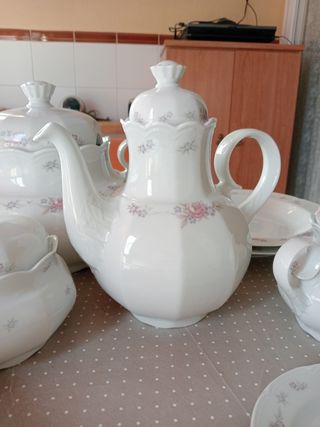 Elegante juego de café de porcelana de la marca Santa Clara. Ideal para disfrutar de un buen café. - Incluye cafetera, azucarero, lechera y 12 tazas con sus platos. - Diseño floral delicado.