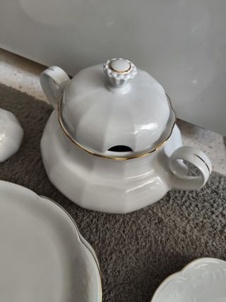 Elegante vajilla de porcelana de Santa Clara con un delicado hilo dorado. - Diseño clásico y atemporal. - Piezas de alta calidad. -Es de 10 servicios, incluye la sopera 3 bandejas,la ensaladera,jarra pequeña,bombonera y dos bandejas pequeñas,40 piezas ,12 servicios de café y jarra de leche.