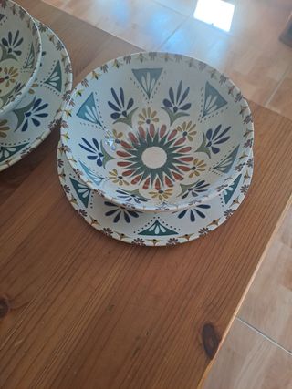 Conjunto de vajilla de cerámica con un diseño vibrante y detallado. 4 llanos, 4 hondos, 4 postre, 4 cuencos - Piezas con motivos florales y geométricos. - Tonos blancos, azules, verdes, rojos y amarillos.