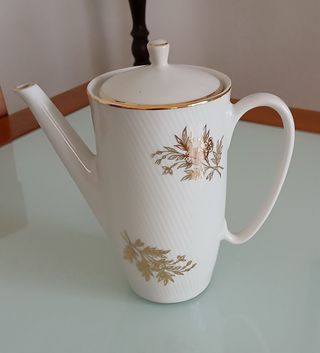 Conjunto de vajilla de porcelana con un diseño clásico y elegante, con detalles en dorado. - 12 platitos - 8 tazas - 1 cafetera - Piezas con aproximadamente 65 años de antigüedad. La tapa de la cafetera está dañada.