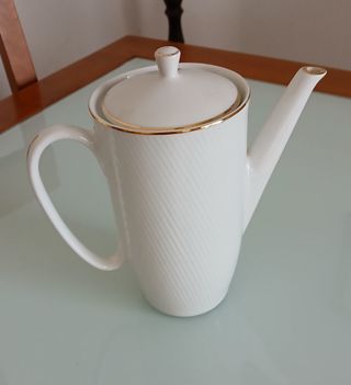 Elegante cafetera de porcelana de la marca Santa Clara. Presenta un diseño clásico con detalles en dorado que le aportan un toque sofisticado. - Acabado blanco con motivos florales dorados. - Borde superior y tapa con ribete dorado.