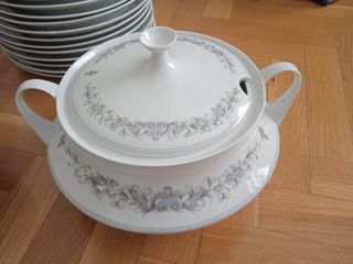 Vajilla blanca, con flores grises. De porcelana. Poquísimo uso. Está impecable 24 platos llanos 12 platos hondos 12 platos de postre 1 sopera, con tapa 1 ensaladera 1 salsera con plato 5 fuentes, 1 de 44 cm, 1 de 40 cm, 1 de 37 cm y dos pequeñas de 26 cm. En caso de envío preguntar