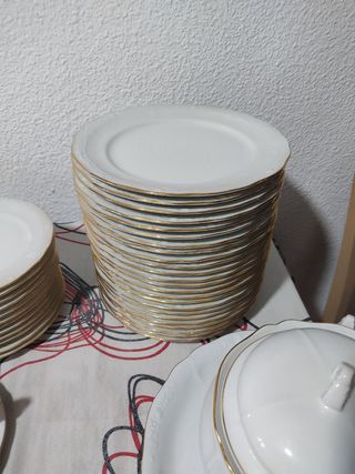 Vajilla de porcelana con borde dorado. Modelo Sevilla. 56 piezas, según se detalla en la caja, platos, fuentes, salsera, etc. No pongo mas fotos para no desmontar la caja. Es un lujo. Escucho ofertas.
