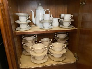 Juego completo de porcelana fina en perfecto estado. Ideal para ocasiones especiales, decoración o coleccionistas. Contenido aproximado del set: • 24 platos grandes • 24 platos hondos o de postre • Juego de té/café: 8 tazas + 8 platillos • Tetera, azucarera y lechera a juego • Sopera con tapa + fuente • Fuentes grandes y pequeñas Diseño floral clásico con detalles en relieve y borde fino. Muy elegante, de porcelana blanca con detalles en rosa, dorado y beige. Perfecta para cenas formales, bodas o como pieza decorativa. Muy bien cuidada, guardada siempre en vitrina.