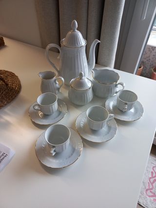 Juego de cafe en porcelana de Santa Clara. Con 10 servicios, cafetera, lechera y azucarero. En perfecto estado. Puedes verlo y recogerlo presencialmente en el Polígono de Raos, Santander. Tlf: 635153338. Abrimos las mañanas de Lunes a Sábado de 10 a 14h y las tardes de Lunes a Viernes de 17 a 20h.