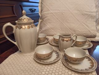 Juego de café de porcelana Santa Clara, con borde dorado: 5 tazas, lechera, cafetera y azucarera.