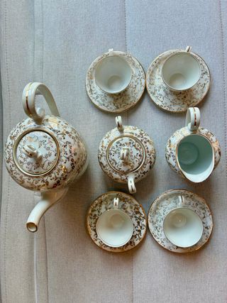 Elegante juego de café de porcelana de marca Santa Clara (Vigo, España), compuesto por: 4 tazas con sus 4 platos 1 cafetera con tapa 1 azucarero con tapa 1 lechera Diseño floral fino en dorado con ribetes brillantes, estilo clásico y sofisticado. En buen estado, sin rayaduras ni roturas. Ideal para ocasiones especiales o para coleccionistas de porcelana española vintage. (Tengo más artículos de menaje a la venta: si te interesan varios, hago descuento por lote o por llevarte todo el conjunto. Pregunta sin compromiso!)