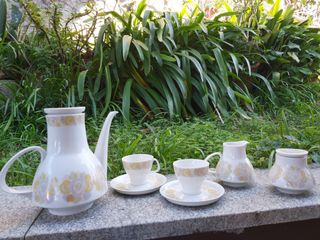 Juego de café de porcelana de los años 60, 4 pocillos y sus platos, lechera, azucarera y cafetera. Está bien conservado.