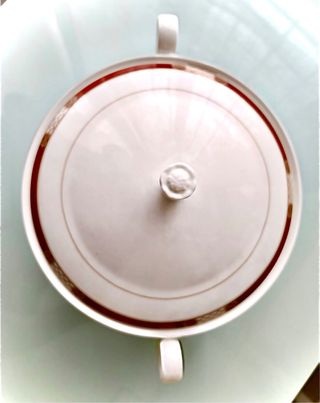 Elegante vajilla Villeroy & Boch con el diseño Pergamon prácticamente a estrenar. - 1 Sopera, 1 bol y un plato grande. - 24 platos llanos - 12 platos hondos - 12 platos pequeños - 12 platos tamaño taza - 12 platillos de postre - 6 platos hondos de postre - más piezas - Piezas de porcelana con detalles en verde y rojo. - Incluye cuenco, sopera y plato ovalado.