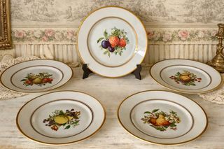 5 platos postre antiguos porcelana 🇫🇷 Limoges (sello M.F. aprox 1920-50) Blancos con decoración frutas (distintas) y borde dorado. Muy buen estado. Diametro 19cm ⚠️1 con pequeña grieta, no roto⚠️ 👉🏻se venden juntos👈🏻 ✅más piezas Limoges en mi perfil✅ ❌NO negociable❌ 🔒NO reservo🔒 📦 Sólo envío, a traves de wallapop📦 Tags (no leer)⛔️ antigua antiguedad antiguedades retro Vintage cocina vajilla pickman cartuja cobre clasico mesa servir servicio cuberteria oro plata menaje glamour lujo france inglesa pastel cena jardin pan loza decorar provenzal modernista royal albert olla taza plato cristal tazon pocillo Coleccion Villeroy Boch te cubierto