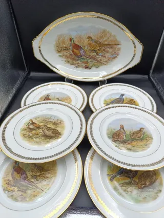 Conjunto de bandeja con 6 platos llanos de porcelana francesa PL de Limoges. Decoración con aves de caza y dorados en los bordes. Medidas: platos con 24cm diámetro y bandeja 41.3x25cm. vintage retro decoración flores decorar porcelana vajilla blanco café te leche cubertería vitrina platillo tacitas tazones plato placa pocillo oro dorado loza cerámica antiguo antigüedades menaje glamour lujo clásico france servicio mesa atrezzo pan vajilla platos meriendas frutero 15ang0126