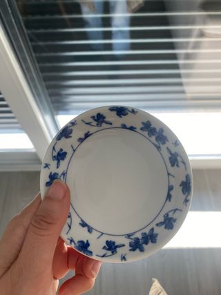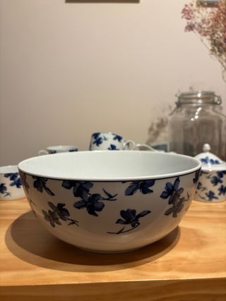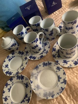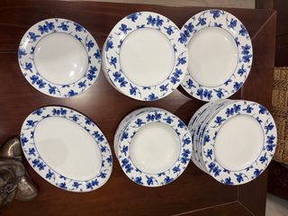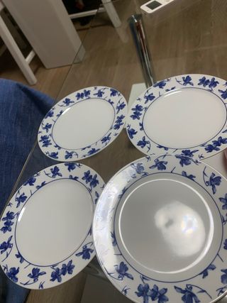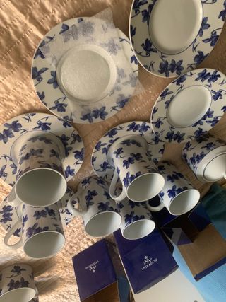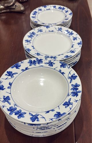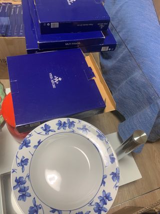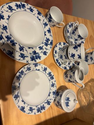 Conjunto de vajilla marca vista alegre con diseño de flores azules sobre fondo blanco. Set café 5 platos + 5 tazas + azucarero + jarrita leche 60 euros 6 platos hondos 23 cm 55 euros 6 platos llanos 28 cm( uno tiene un pequeño roto adjunto foto) 50 euros 7 platos de postre 21 cm ( uno tiene un pequeño roto adjunto foto) 50 euros Una ensaladera 25 euros Dos bandejas ovaladas 25 euros cada una 40 las dos Dos bandejas redondas 25 euros cada una / 40 las dos 4 tazas desayuno altas 6 euros cada una si te llevas todo te lo dejo en 260
