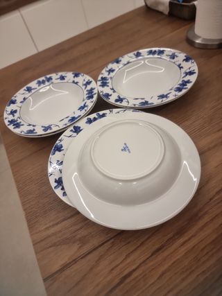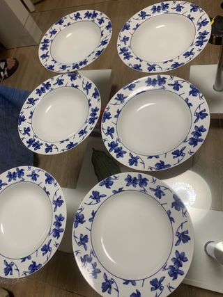 Se venden 6 platos hondos de la marca Vista Alegre con un bonito diseño de flores azules. - Diseño floral azul. - Fabricados en porcelana. Tienen 23 cm de diámetro Tengo otros 6 mas por si alguien necesita 12