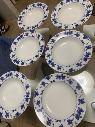 Se venden platos de la marca Vista Alegre, disponibles para comprar por separado.platos hondos y llanos a 12 euros cada 1)platos de postre a 10 euros casa 1)6 tazas con 6 platos)60 euros.preguntar no negociable - Diseño con flores azules sobre fondo blanco. - Piezas de cerámica y porcelana.en su caja original