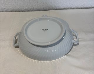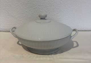 Elegante sopera de la marca Vista Alegre, modelo Sagres. Una pieza clásica para tu mesa. - Diseño con relieve en espiral en la tapa. - Asas laterales. - Base elevada. - Las medidas son: longitud=35 cm, altura=17 cm y anchura=25 cm. Apenas se ha usado.