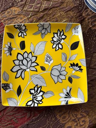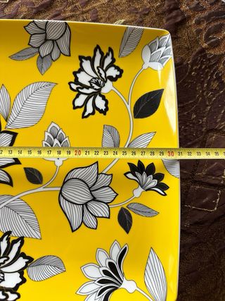 Plato grande con un diseño floral llamativo en tonos blanco y negro sobre un fondo amarillo vibrante. Ideal para añadir un toque de color y estilo a tu mesa. - Diseño floral detallado. - Forma cuadrada con bordes suaves.