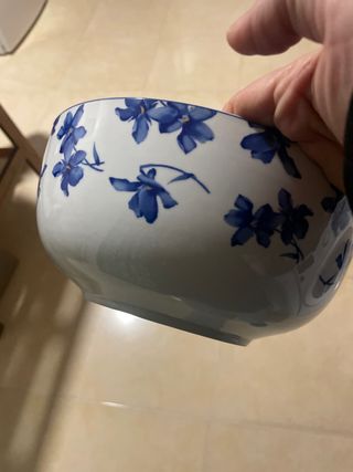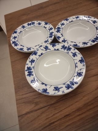 Conjunto de platos hondos con un bonito diseño floral. - Diseño de flor azul sobre fondo blanco. - Borde decorado con el motivo floral.guardado siempre en vitrina.