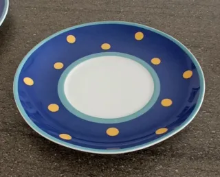 Conjunto de seis platos de porcelana de la prestigiosa firma Vista Alegre.La fabrica de fundo en 1824 junto Aveiro , al sur de Oporto. Las piezas se caracterizan por si estilo , diseño y calidad , unida a su resistencia y durabilidad . - Diseño alegre de lunares amarillos sobre fondo azul. - Borde interior en tono turquesa. Diámetro 17 cm