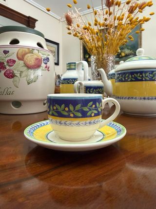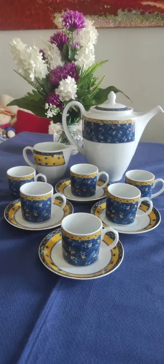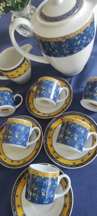 Elegante juego de 5 tazas y 5 platillos de la reconocida marca Vista Alegre. Ideal para disfrutar de tu café o té. Incluye, Cafetera, 2 lecheras, azucarero y tetera - Diseño floral con detalles en azul y amarillo. - Fabricado en porcelana de alta calidad.