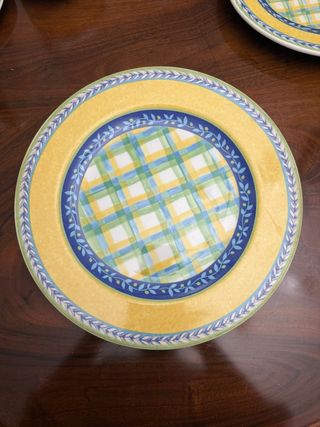 Juego de bajos platos de la marca Vista Alegre con un diseño a cuadros en tonos verdes, azules y amarillos. El borde exterior es amarillo con un detalle decorativo en azul y verde. - Diseño a cuadros. - Borde decorativo.
