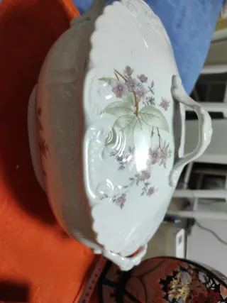 Elegante sopera de la reconocida marca Vista Alegre, con un delicado diseño floral. - Pieza de porcelana con detalles en relieve. - Motivos florales en tonos rosas y verdes.