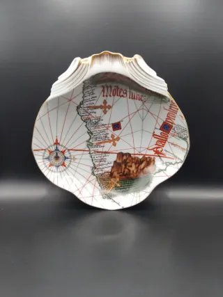 Fuente decorativa de porcelana con un diseño inspirado en mapas antiguos y motivos náuticos.hago envíos por wallapop mira mi perfil hay muchas cosas que te pueden interesar en el. pero míralooo vintage , duralex ,coleccion , limoges , haviland , gres , ceramica , loza , porcelana , art deco , hogar , mesa , antiguo , san claudio , santa clara , sargadelos , ancient , cartuja , sevilla , pickman , vargas , segovia , hervidor , decoracion , antiguedad , vajilla , arcopal , porcelana inglesa , le creuset - Borde con detalles dorados. - Diseño detallado con brújula y elementos cartográficos. - Forma de concha. - Pieza de colección.