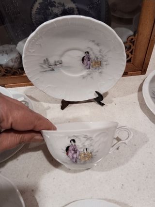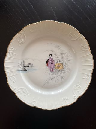 4 platos de porcelana con un diseño oriental. - Borde festoneado con detalles dorados. - Ilustración de una geisha y grullas. - Acabado brillante. - Fabricados por la reconocida fábrica portuguesa Vista Alegre También dispongo de más piezas del mismo servicio.