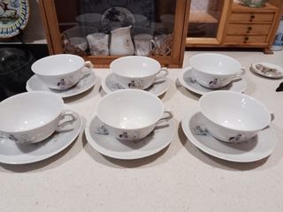 Juego de taza y plato de consomé en porcelana fina de la afamada fabrica Vista Alegre . En perfecto estado Aptas para lavavajillas y microondas. Se venden conjunto de taza y plato : 18 € Dispongo de 8 conjuntos. Se hace descuento al comprar varios juegos - Diseño floral en tonos azules y amarillos. - Fabricadas en porcelana.