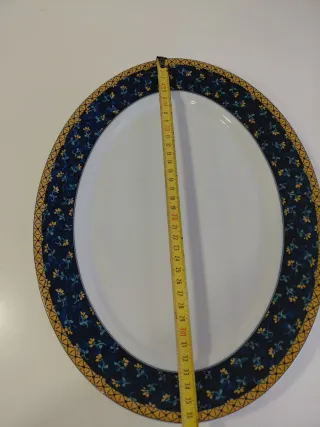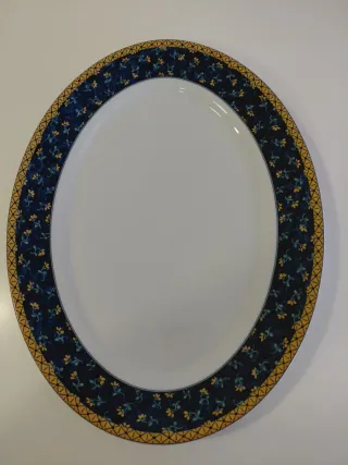 Elegante fuente ovalada de porcelana de la marca Vista Alegre. Presenta un bonito diseño con motivos florales en tonos azules y dorados. En perfecto estado: apenas se ha usado. Apta para lavavajillas y microondas. Medida 36cm x 27 cm - Material: Porcelana - Color: Azul y dorado - Diseño: Motivos florales