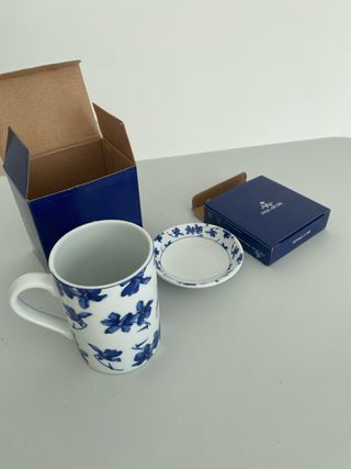 Set de dos tazas mug con sus platillos a juego, con un bonito diseño floral. - Diseño floral azul sobre fondo blanco. - Ideales para té o café.1 taza con platillo 14 euros)2 por 28) si desea mas tengo mas)