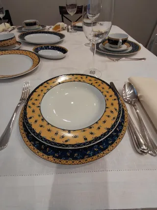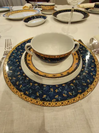 Elegante vajilla completa y a estrenar de porcelana de la marca Vista Alegre. Modelo Salina Portugal. Un conjunto perfecto para cualquier ocasión. Consta de 24 platos llanos: 12 platos soperos, 12 platos de postre, 11 tazas de consomé con su plato correspondiente, sopera con tapa ,ensaladera, salsera, 2 platos de aperitivo, 1 fuente redonda grande y dos fuentes grandes ovaladas. - Diseño con detalles en amarillo y azul. - Incluye platos, tazas y fuentes. - Piezas de alta calidad.