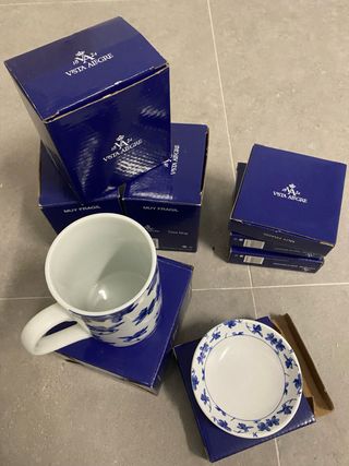 Conjunto de 6 tazas tipo mug y un azucarero de la marca Vista Alegre. El diseño presenta un delicado estampado floral en tonos azules sobre fondo blanco. - Diseño floral azul y blanco. - Incluye 6 tazas con sus platos y 1 azucarero.todo nuevo en su embalaje original,tengo mas cosas de vista alegre (preguntar)