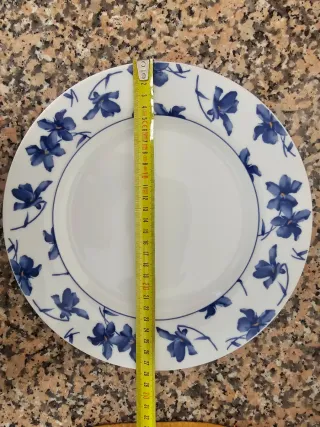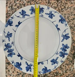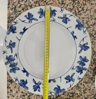 Conjunto de dos platos de porcelana con un bonito diseño floral azul sobre fondo blanco. Uno mide 28 cm y el otro 31 cm. - Diseño floral azul. - Borde decorado. - 7 platos de 28 cm -3 platos de 31 cm