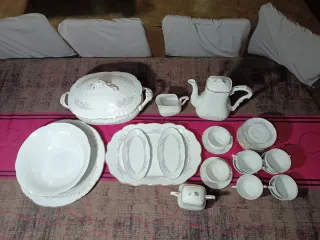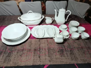 Elegante vajilla de porcelana completa, con un delicado diseño floral y un distintivo ribete dorado. Está en perfectas condiciones, nunca se ha usado. - Piezas con detalles florales en tonos rosados. - Acabado brillante en todas las piezas. - Incluye cafetera, lechera, azucarero. - 12 tazas con sus platitos. - Sopera, ensaladera, fuente grande redonda, fuente grande ovalada y 2 fuentes pequeñas ovaladas.