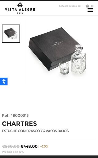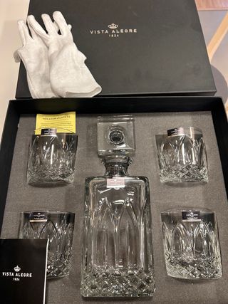 Elegante juego de bar de la marca Vista Alegre, perfecto para servir tus bebidas favoritas con clase y estilo. Incluye una botella y 4 vasos. - Diseño clásico y refinado. - Piezas de cristal tallado. - Incluye guantes de protección para su manipulación. -Pieza de coleccionista