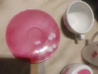 Elegante juego de café de la marca Vista Alegre, perfecto para añadir un toque de distinción a tu mesa. Fabricado en porcelana de alta calidad. - Diseño con detalles florales en tonos rosas y blancos. - Incluye 12 tazas y 12 platos, 30 euros cada plato y taza. -Tetera. -Jarra de Leche y recipiente de azúcar.