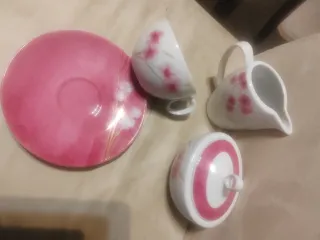 Elegante juego de porcelana para té o café, con un delicado diseño floral. - Incluye cafetera, lechera, azucarero y tazas con sus platos. - Piezas con detalles en color rosa.