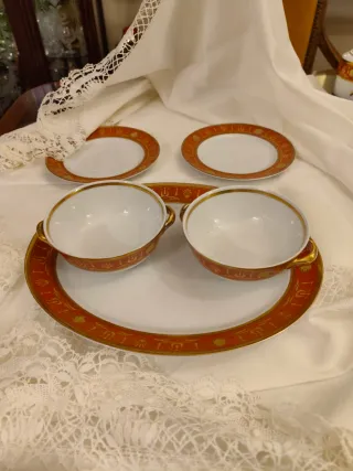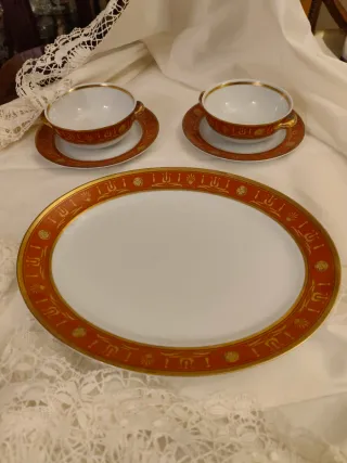 Elegante vajilla de Vista Alegre en el distintivo color Empire Red. - Diseño con borde decorado en rojo y oro. - Incluye dos tazas de consomé de 12 cm de diámetro y 5 de alto, con sus platos de 17 cm y una fuente ovalada de 30 x 24 cm.