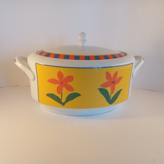 Elegante sopera de porcelana con un diseño alegre y colorido. Perfecta para servir tus platos favoritos con estilo. - Decorada con flores naranjas y detalles de cuadros. - Asa y tapa a juego. - En perfectas condiciones.