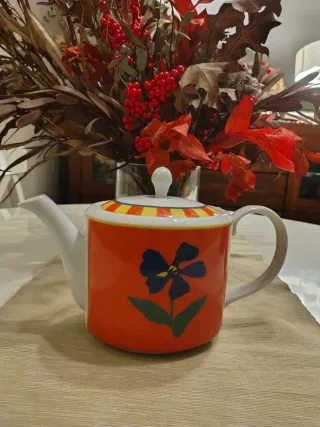 Tetera de porcelana con un diseño alegre y colorido de la marca portuguesa Vista Alegre. Colección Flower Harmony, modelo Yellow Flower. Sin uso, siempre guardada en aparador. 13 cm de alto.