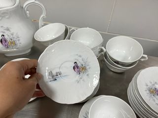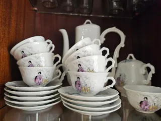 Elegante juego de té de porcelana fina, con un delicado diseño oriental. - Incluye tetera, azucarero y 9 tazas con sus platillos. - Decoración con figuras de damas orientales y motivos florales. - Piezas de porcelana blanca de alta calidad.