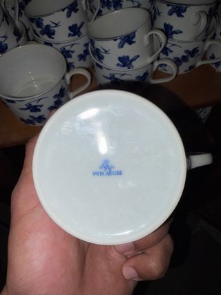 Set de dos tazas con sus respectivos platos de la marca Vista Alegre. El diseño presenta un delicado estampado floral en tonos azules sobre fondo blanco. - Diseño floral azul y blanco. - Fabricadas en porcelana. Tengo más si necesitas. Tambien disponible: Azucarero y Jarrita leche, Plstis vajilla, Fuentes de horno y planas ovaladas de mesa